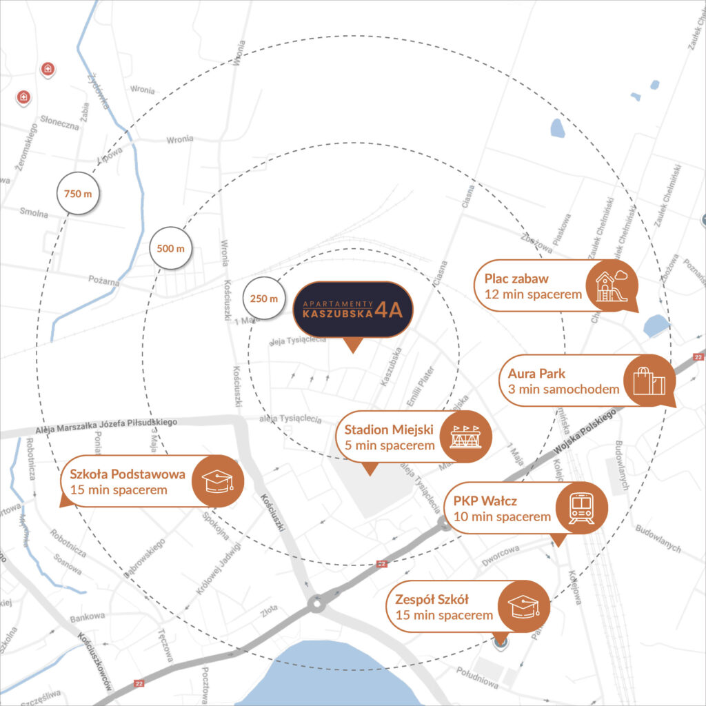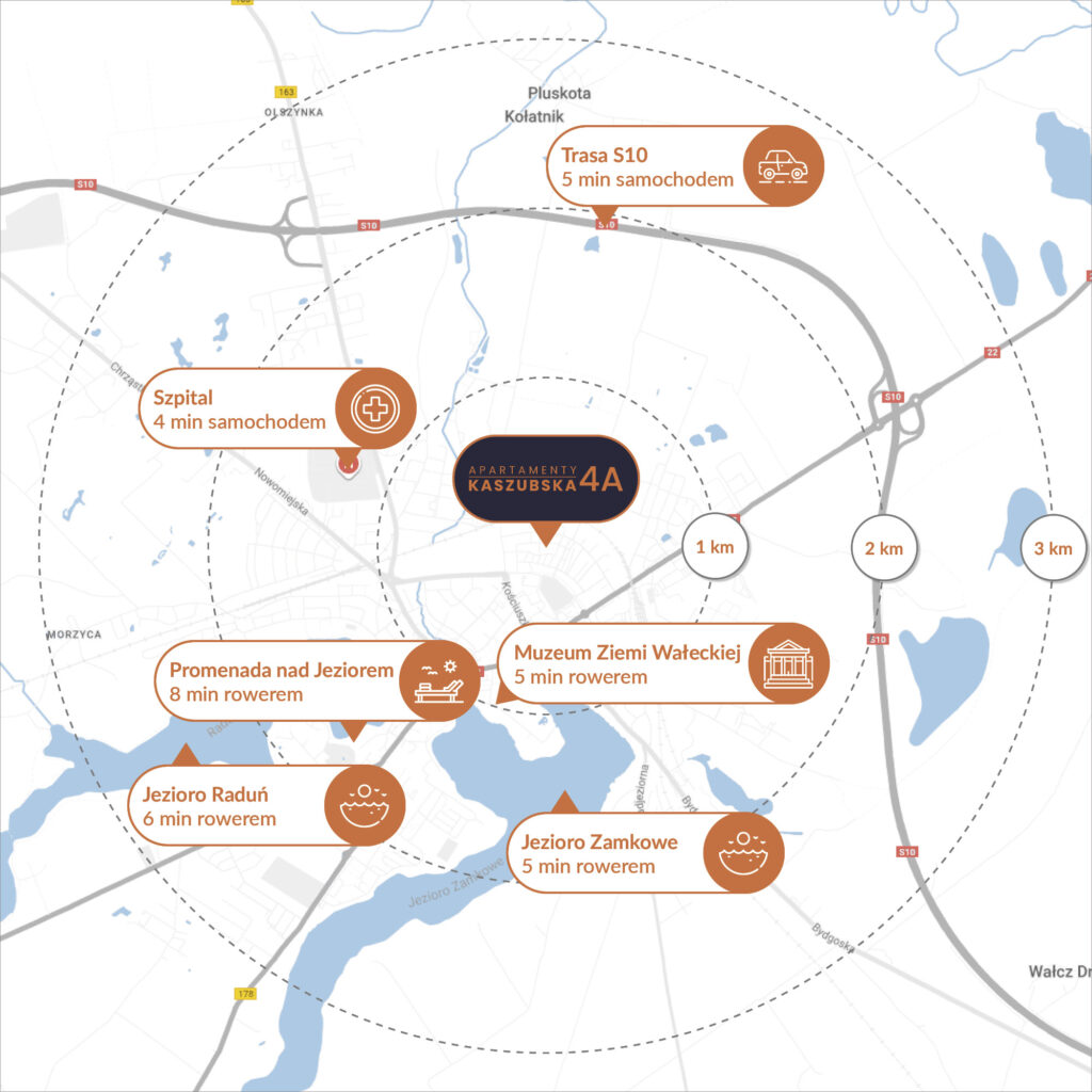 Wokół inwestycji znajdziesz wszystko, co potrzebne na co dzień: sklepy, restauracje, szkoły, punkty usługowe i miejsca, gdzie można złapać oddech. Bliskość miejskiej infrastruktury łączy się tu z przyjaznym otoczeniem natury. Po pracy możesz wybrać się na spacer po pobliskiej promenadzie nad jeziorem Raduń, spotkać się ze znajomymi w centrum albo po prostu odpocząć w cichszy, w swojej prywatnej przestrzeni – dokładnie tak, jak lubisz.